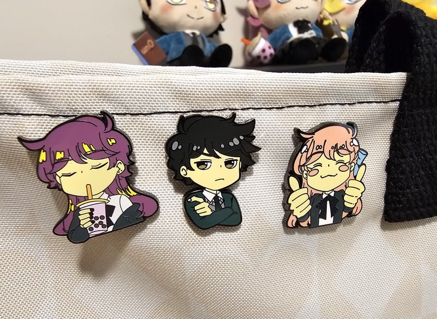Set of 3 emote pins: - Approving Remi - Indifferent Sera - Impatient John